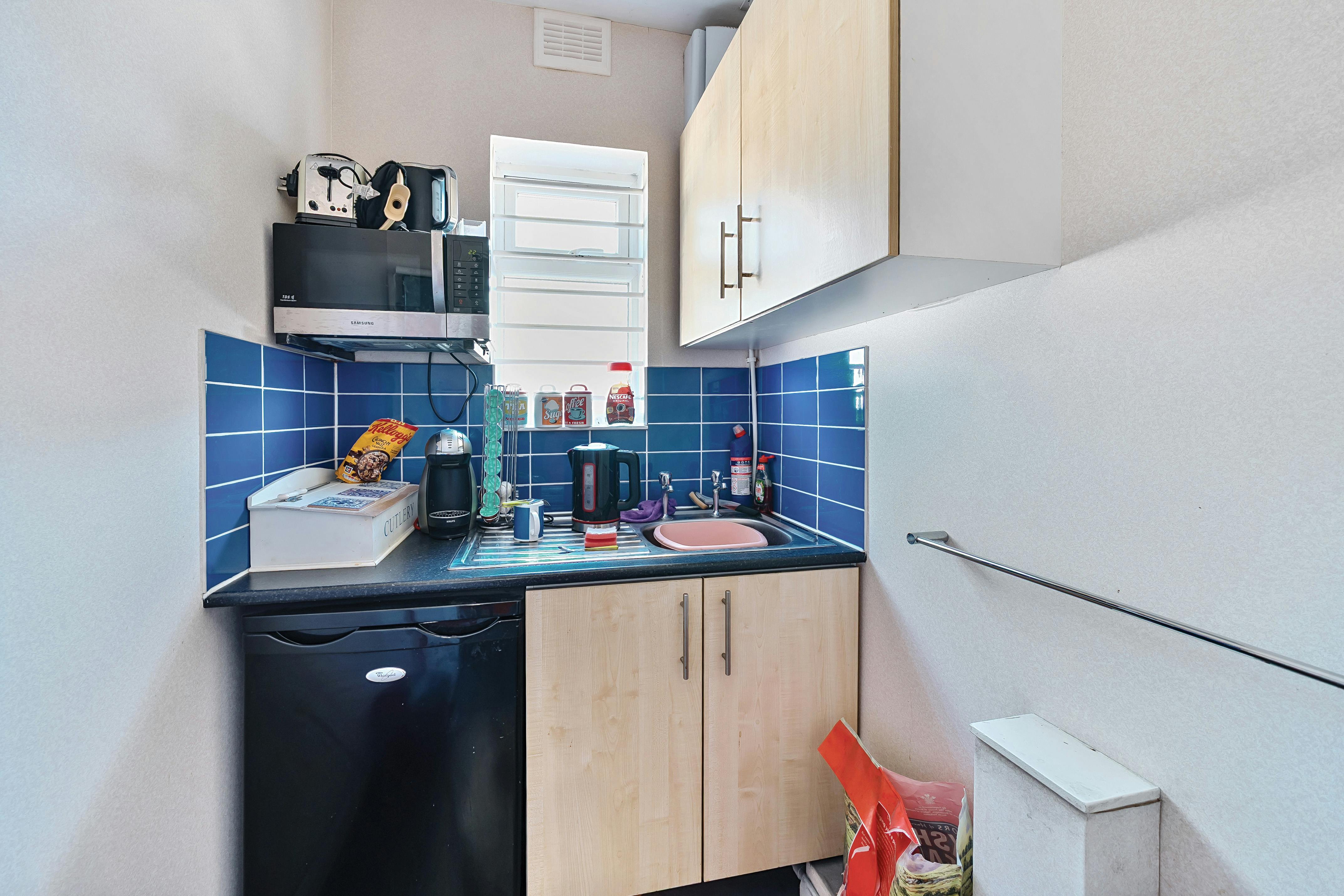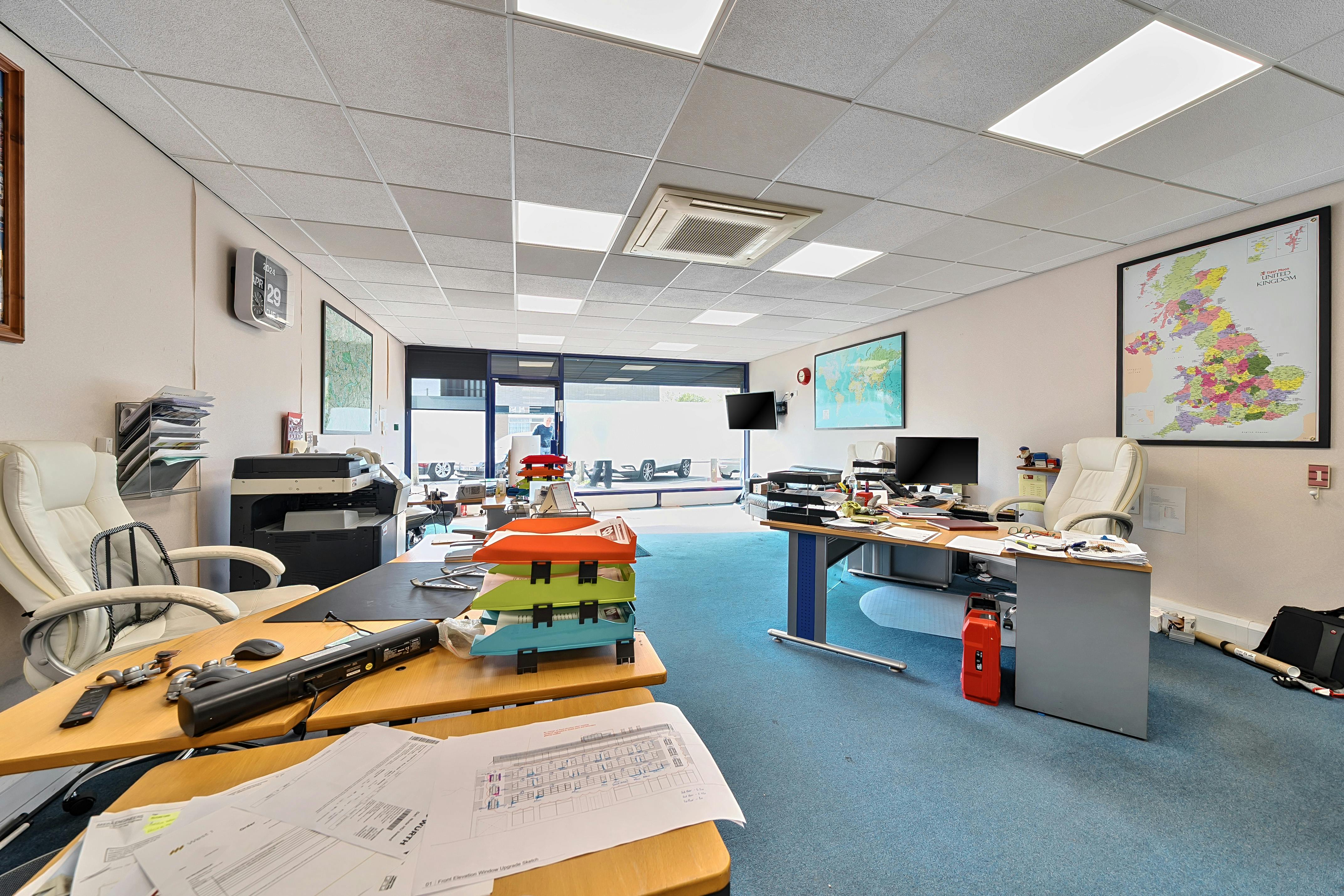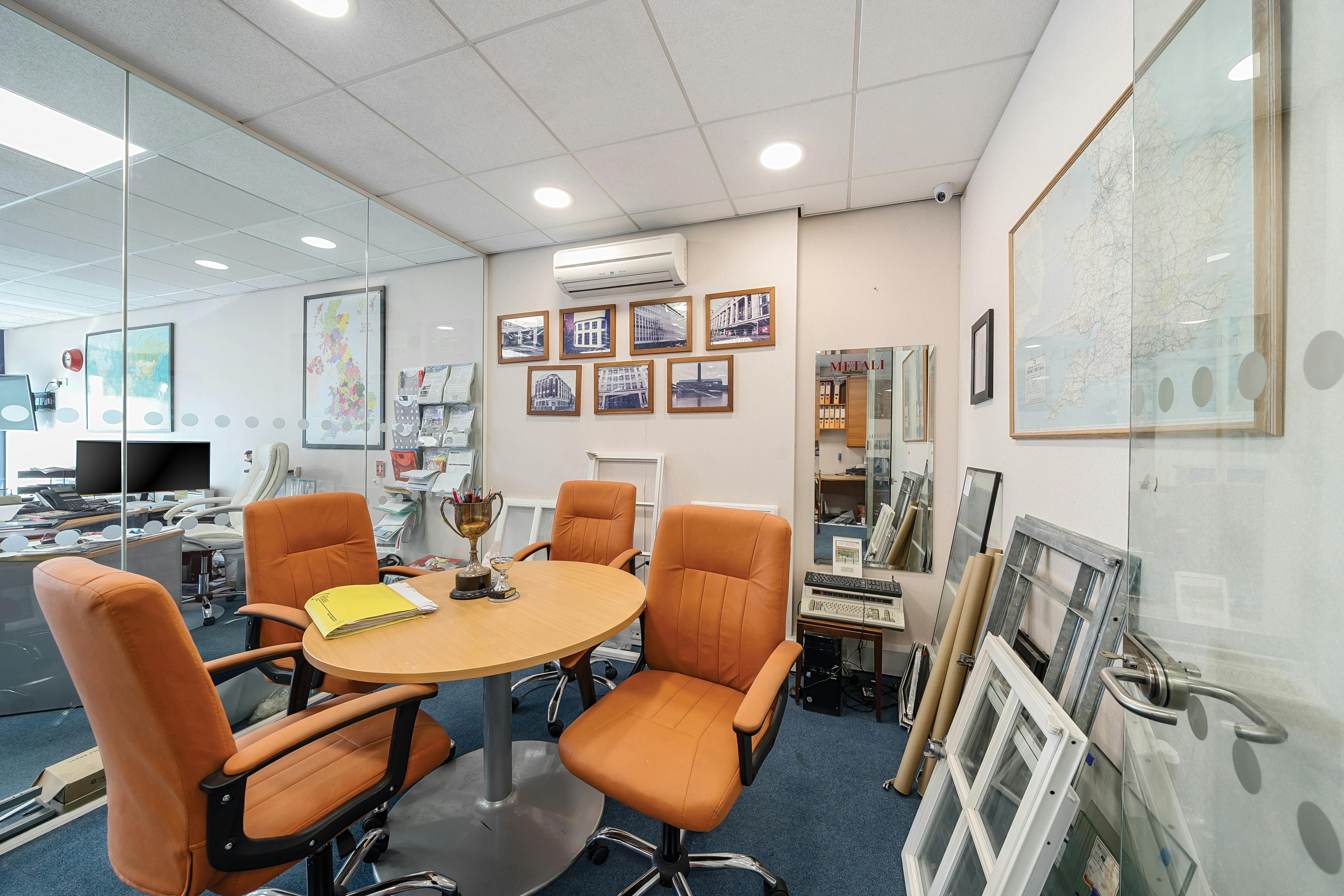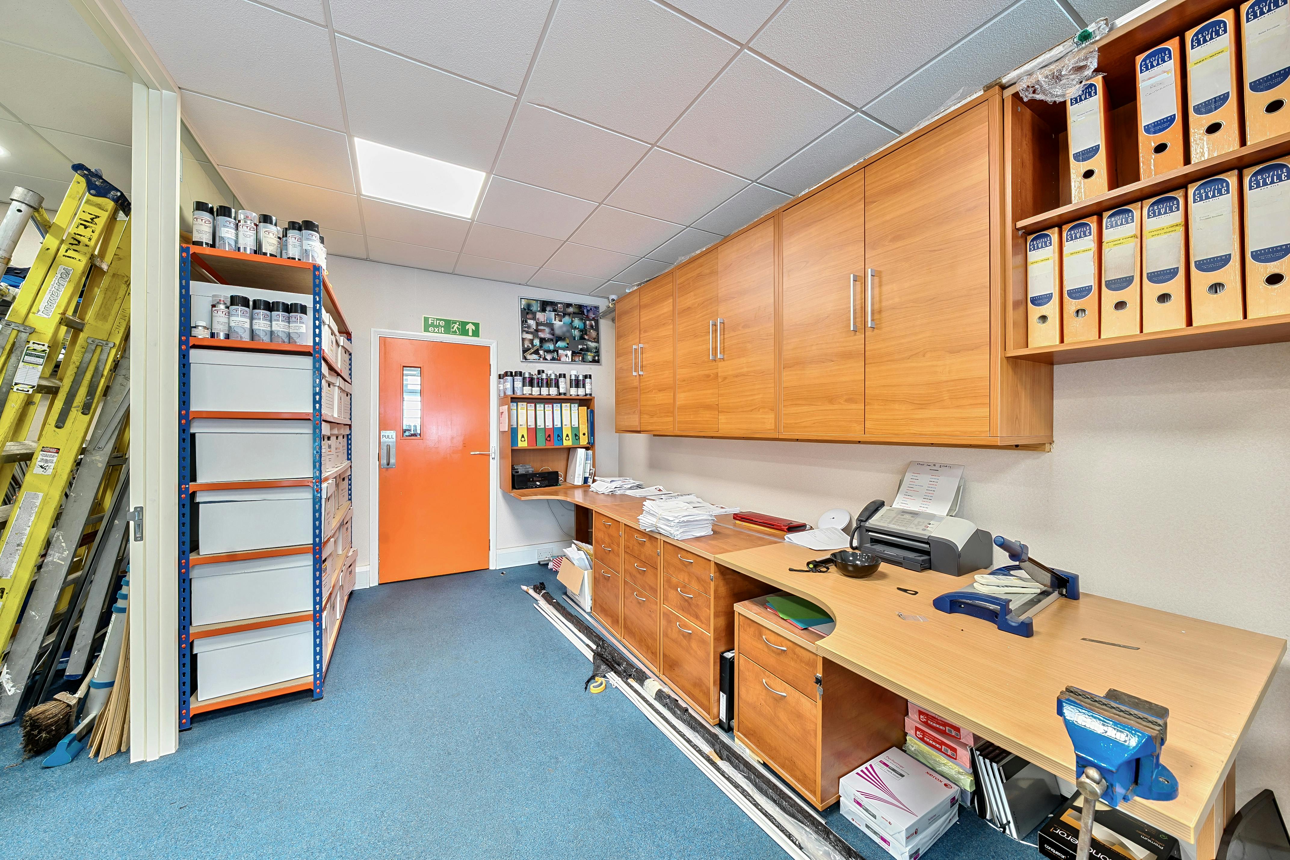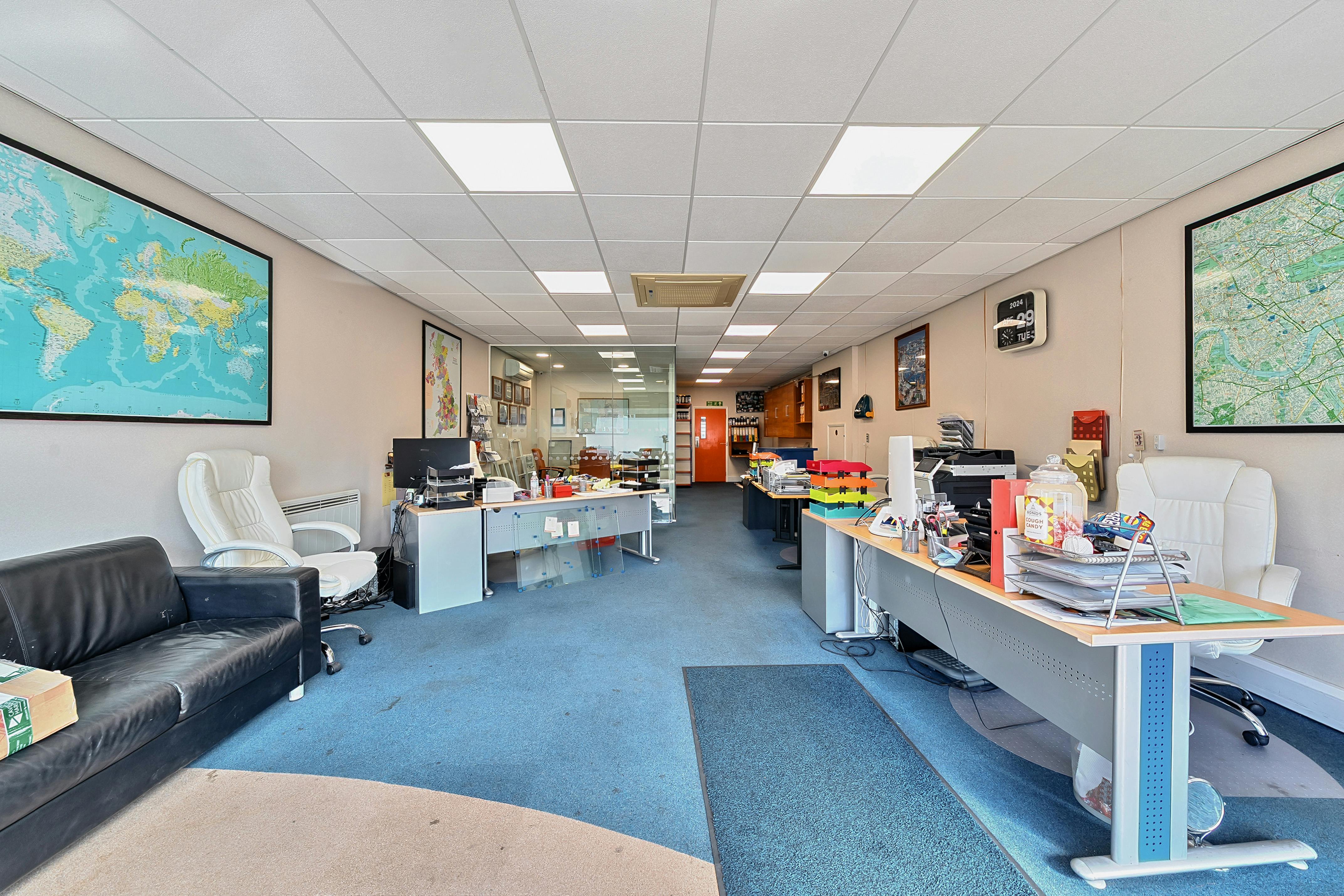The property comprises a mid-terrace lock-up shop of 875 ft². The ground floor is currently divided to form a large open plan area to the front with glazed meeting room and storeroom. To the rear there is a further store with kitchen and toilet.